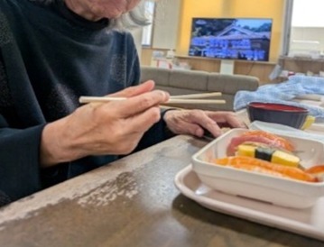 伊藤篤様)年に一度の握り寿司イベントも好評です。幸いなことにまだクックサーブの体制はあるため、厨房で握ってもらっています。刻み食やソフト食のシャリも食べやすいよう、酢飯をかゆ状にしてからゲル化剤を用いて形成。ミキサーも酢飯とネタをミキサーにかけ、味付けやトロミ具合を調整してお弁当箱に盛り付けて提供しています。