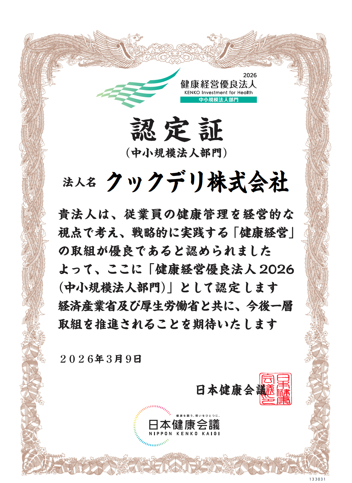 令和8年3月9日付で、経済産業省と日本健康会議が共同で選出する「健康経営優良法人2026(中小規模法人部門)」に認定されました。