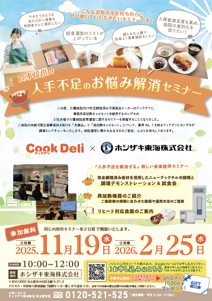 この度、介護施設向け完全調理済み冷凍食品メーカーのクックデリと、業務用再加熱キャビネットを販売するホシザキの2社共催で介護施設厨房運営に関するセミナーを開催することとなりました。